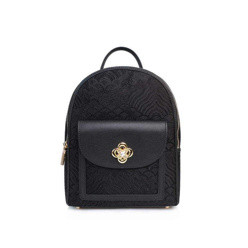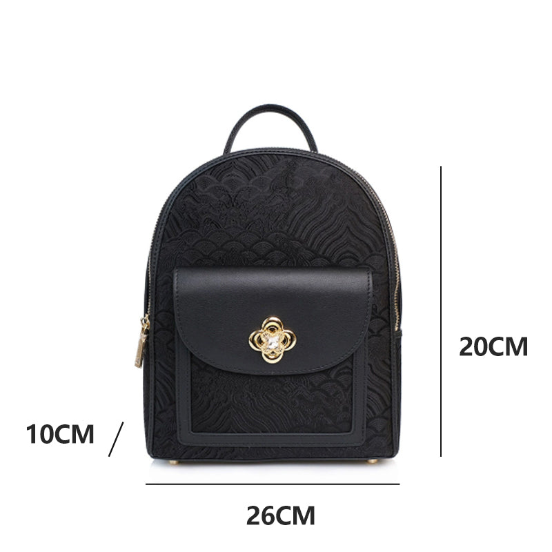 Gorgeous glossy cloud brocade; exquisite unique Chinese patterns; comfortable load-reducing backpack design, spacious.